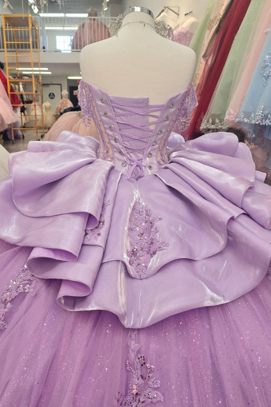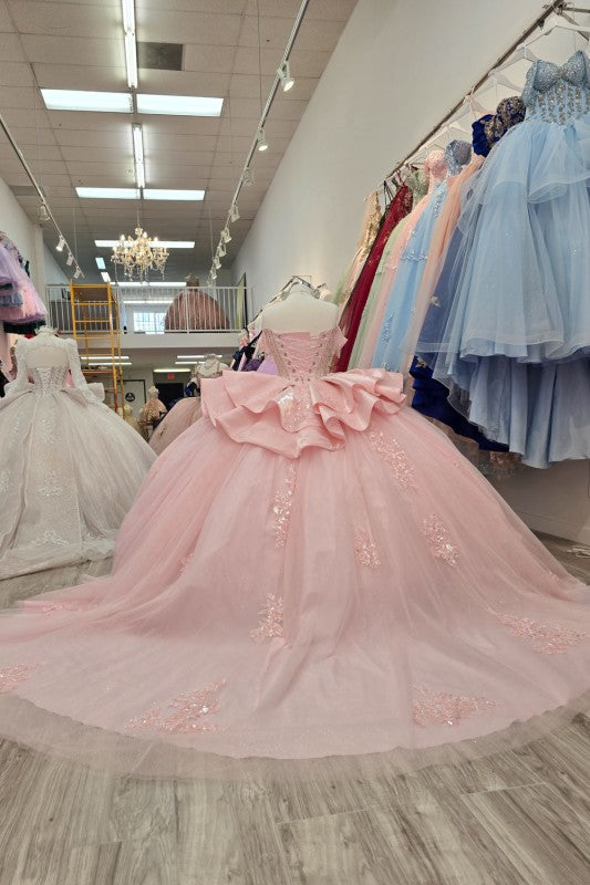 Step into the spotlight in this breathtaking quinceanera gown designed to make your special moment unforgettable. Crafted from luxurious polyester with an off-shoulder silhouette adorned with epaulets beading, this ball gown features a stunning see-through boning corset with intricate laced detailing. Shimmering sequins, pearls, and beads cascade throughout the dress, while iridescent gemstones and gem accents at the bodice catch every light. Ruffled silk and glitter tulle overlays create dramatic movement, complemented by a sweeping train. The hidden lower back zipper ensures a seamless fit in sizes XS-3XL. Perfect for 2024-2025 trends